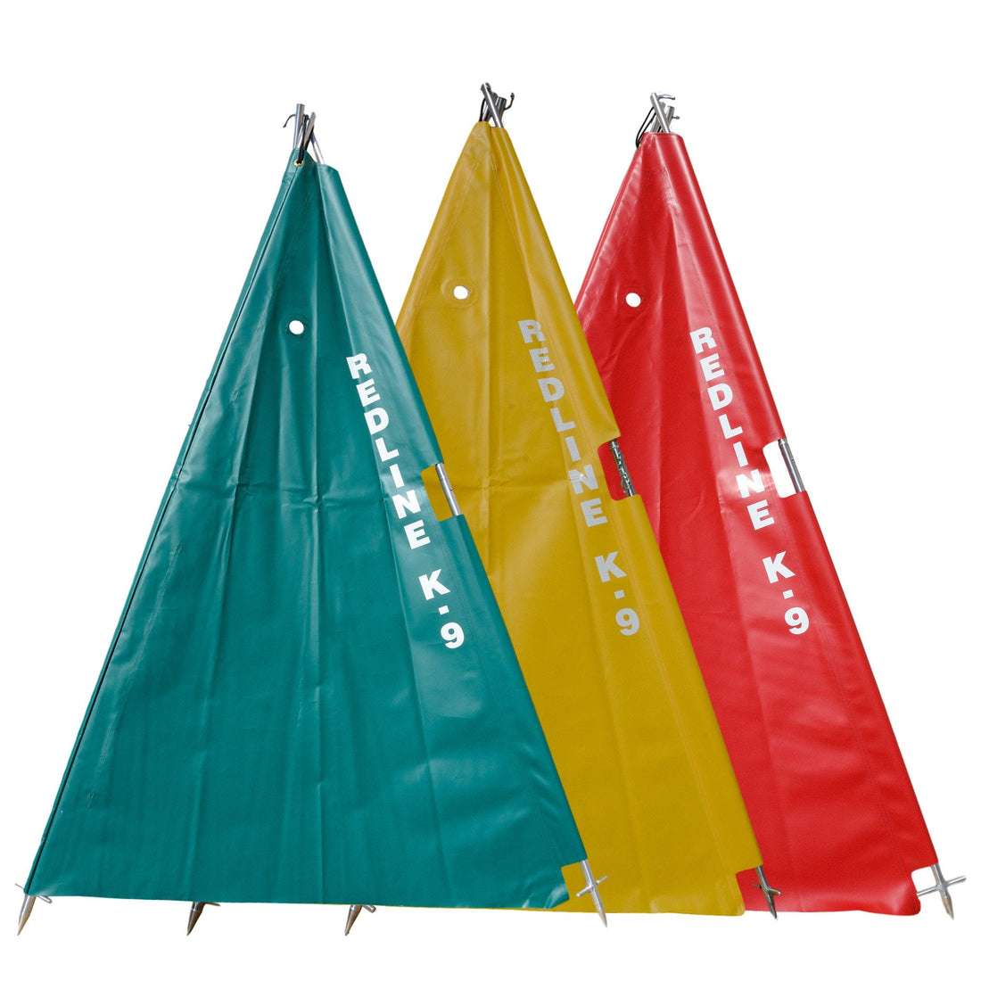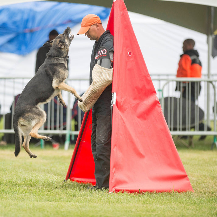 Our portable collapsible blinds are perfect for Schutzhund and IGP training and trials. Blinds are constructed from aluminum poles that easily come apart in the middle with a simple push button mechanism for easy transportation. Blind poles have strong aluminum spikes and solid anchoring steps to push the feet securely in to the ground. The sail is made from heavy duty vinyl, available in your choice of 3 colors and includes two large peep holes.